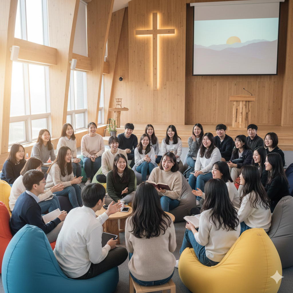 🙏 예배와 말씀: 매주 [요일/시간]에 모여 뜨겁게 찬양하고, 살아있는 말씀으로 은혜를 나눕니다. 말씀을 통해 세상을 살아갈 지혜와 용기를 얻고, 주님과의 깊은 교제를 경험합니다.